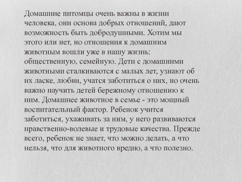 дают возможность быть добродушными. Хотим мы этого или нет, но отношения к домашним животным вошли уже в нашу жизнь: общественную, семейную. Дети с домашними животными сталкиваются с малых лет, узнают об их ласке, любви, учатся заботиться о них, но очень важно научить детей бережному отношению к ним. Домашнее животное в семье - это мощный воспитательный фактор. Ребенок учится заботиться, ухаживать за ним, у него развиваются нравственно-волевые и трудовые качества. Прежде всего, ребенок не знает, что можно делать, а что нельзя, что для животного вредно, а что полезно.