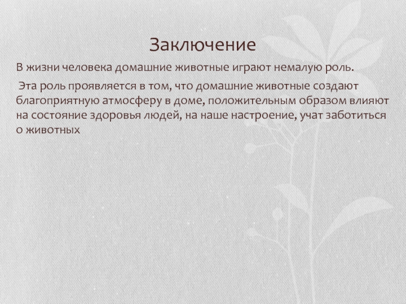 в том, что домашние животные создают благоприятную атмосферу в доме, положительным образом влияют на состояние здоровья людей, на наше настроение, учат заботиться о животных