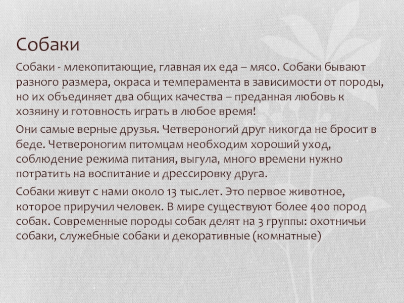 Собаки живут с нами около 13 тыс.лет. Это первое животное, которое приручил человек. В мире существуют более 400 пород собак. Современные породы собак делят на 3 группы: охотничьи собаки, служебные собаки и декоративные (комнатные)