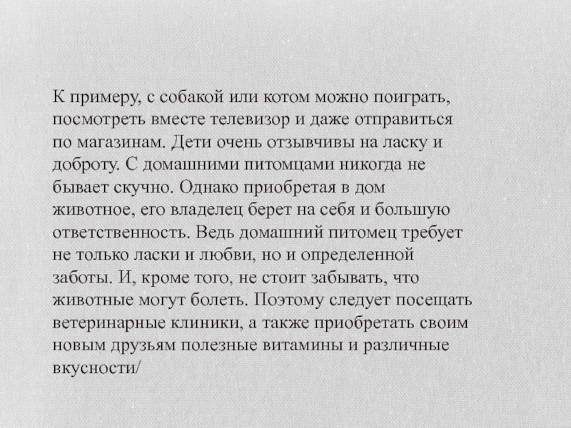 и даже отправиться по магазинам. Дети очень отзывчивы на ласку и доброту. С домашними питомцами никогда не бывает скучно. Однако приобретая в дом животное, его владелец берет на себя и большую ответственность. Ведь домашний питомец требует не только ласки и любви, но и определенной заботы. И, кроме того, не стоит забывать, что животные могут болеть. Поэтому следует посещать ветеринарные клиники, а также приобретать своим новым друзьям полезные витамины и различные вкусности/