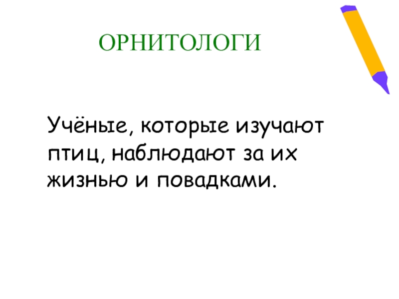 ОРНИТОЛОГИ Учёные, которые изучают птиц, наблюдают за их жизнью и повадками.