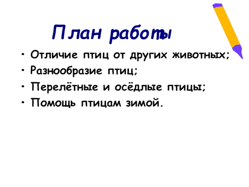 План работыОтличие птиц от других животных;Разнообразие птиц;Перелётные и осёдлые птицы;Помощь птицам зимой.