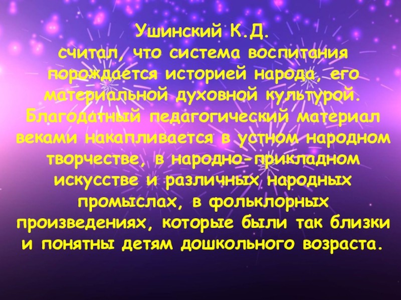 Ушинский К.Д. считал, что система воспитания порождается историей народа, его материальной духовной культурой. Благодатный педагогический материал веками накапливается в устном народном творчестве, в народно-прикладном искусстве и различных народных промыслах, в фольклорных произведениях, которые были так близки