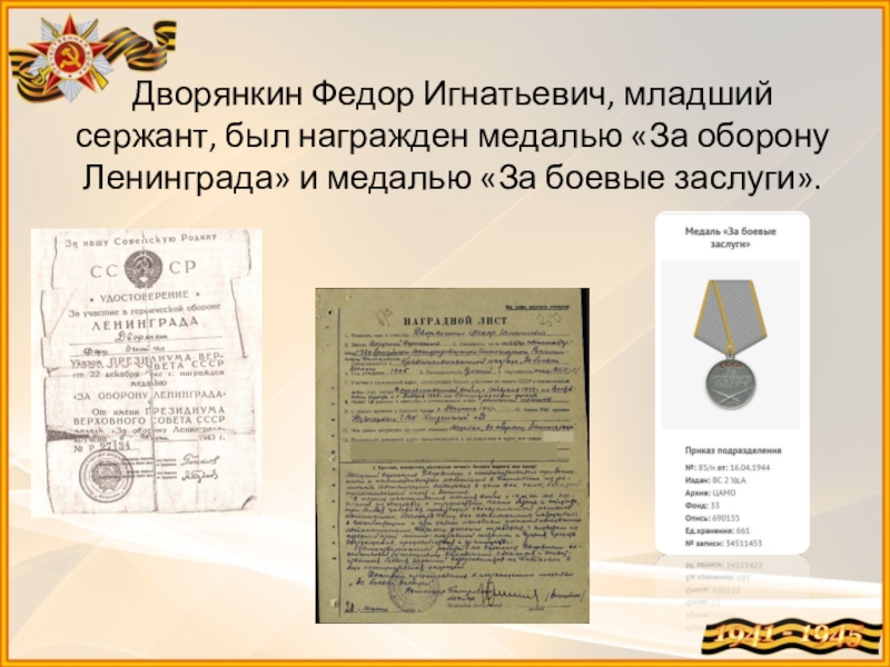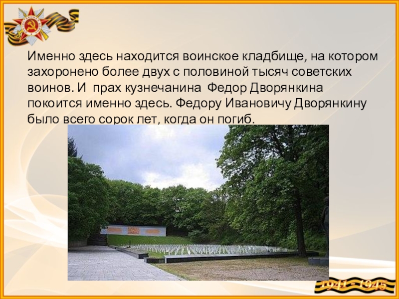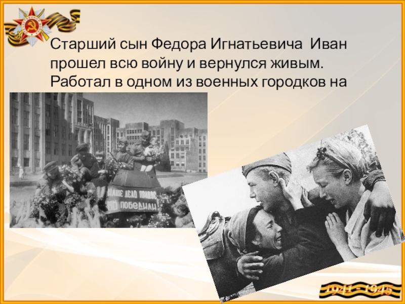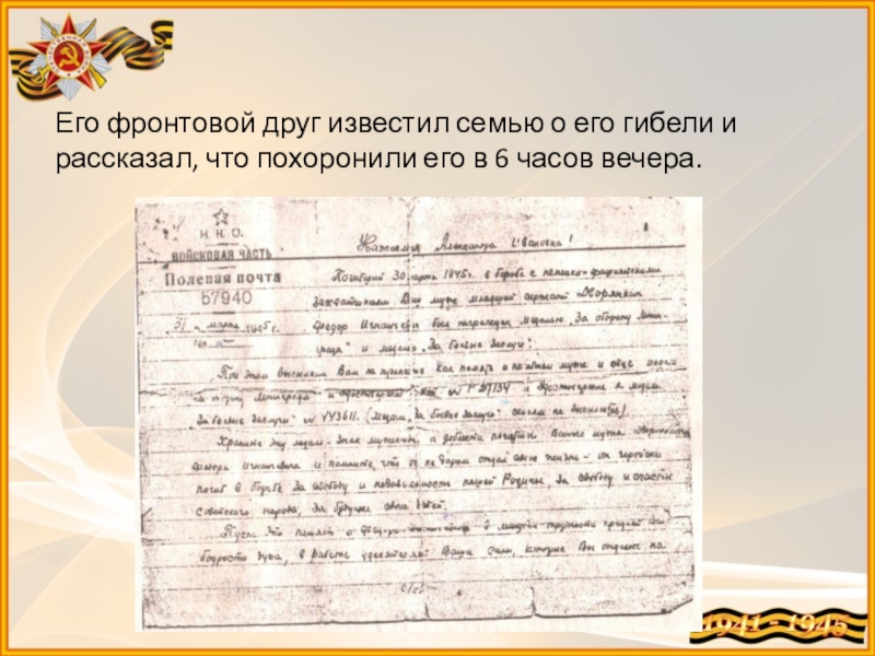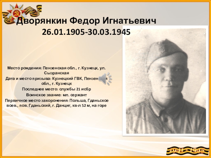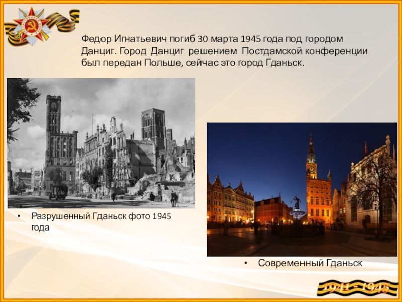 Федор Игнатьевич погиб 30 марта 1945 года под городом Данциг. Город Данциг решением Постдамской конференции был передан Польше, сейчас это город Гданьск.