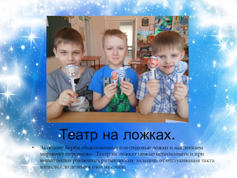 мордочку персонажа. Театр на ложках можно использовать и при выполнении различных ритмических заданий: от отстукивания такта мелодии до деления слов на слоги.