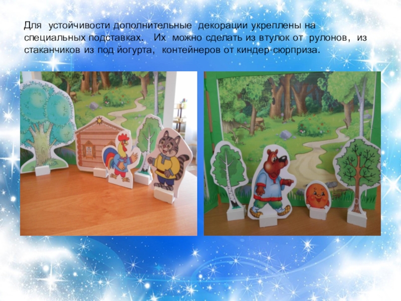 Слайд 10Для устойчивости дополнительные декорации укреплены на специальных подставках. Их можно