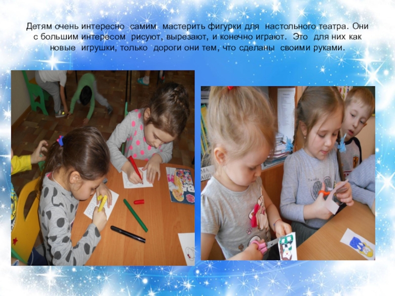Слайд 14Детям очень интересно самим мастерить фигурки для настольного театра. Они с