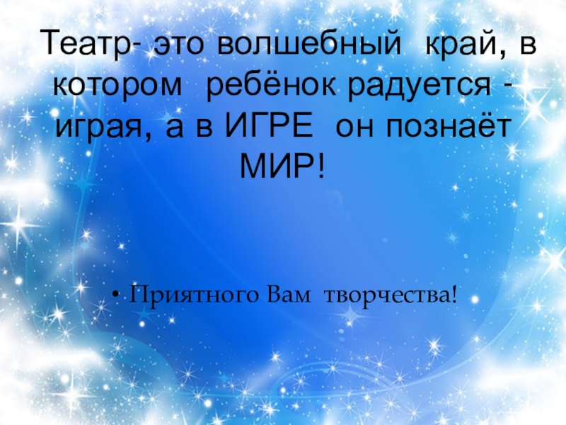 Слайд 18Театр- это волшебный край, в котором ребёнок радуется - играя, а