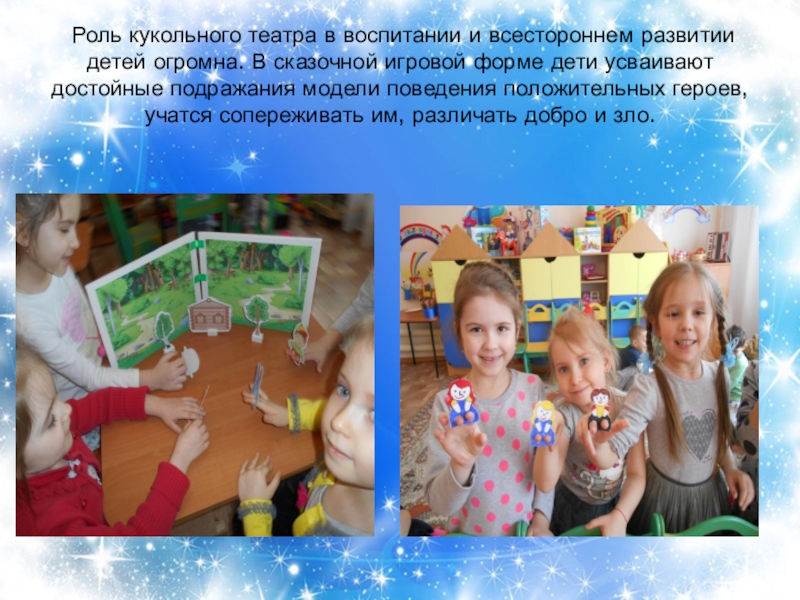 Слайд 5 Роль кукольного театра в воспитании и всестороннем развитии детей огромна.
