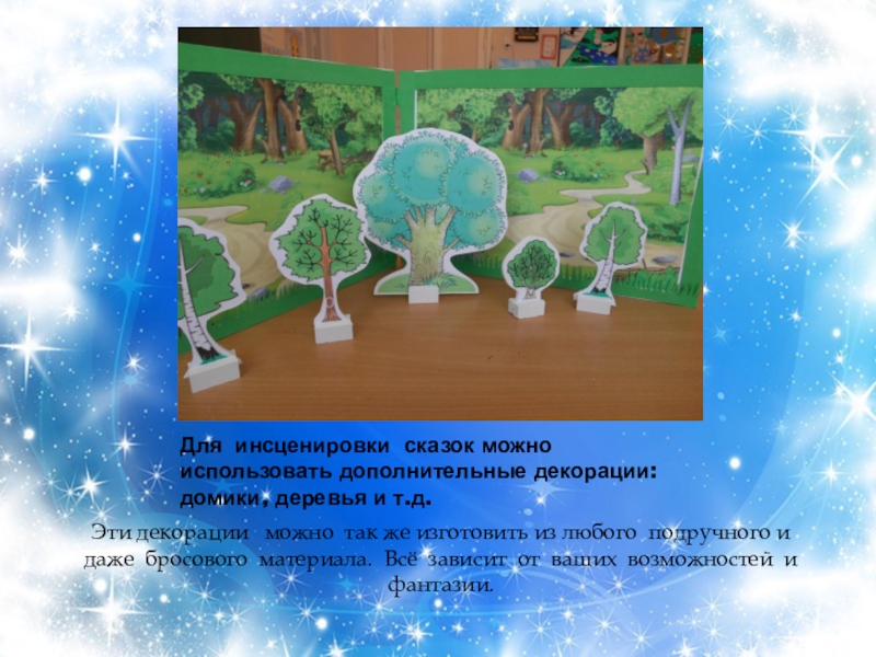 Слайд 11Для инсценировки сказок можно использовать дополнительные декорации: домики, деревья и т.д.
