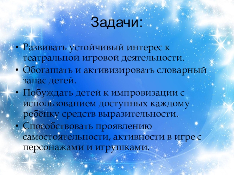 Развивать устойчивый интерес к театральной игровой деятельности.