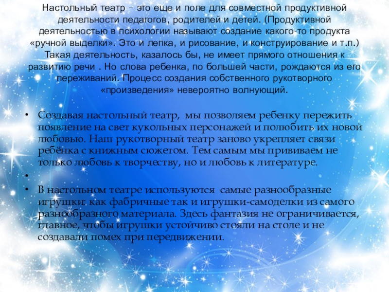 Слайд 6Настольный театр – это еще и поле для совместной продуктивной деятельности
