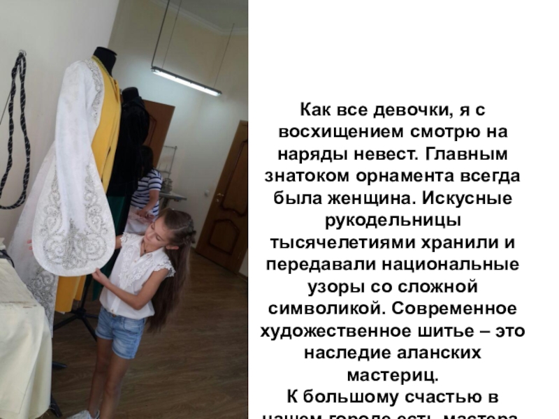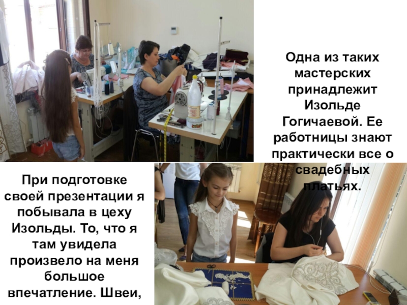 При подготовке своей презентации я побывала в цеху Изольды. То, что я там увидела произвело на меня большое впечатление. Швеи, используя различные виды тканей, создавали нижние платья, нарядные халаты.