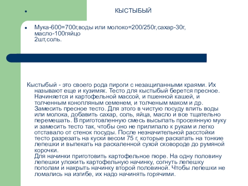 Кыстыбый - это своего рода пироги с незащипанными краями. Их называют еще и кузимяк. Тесто для кыстыбый берется пресное. Начиняется и картофельной массой, и пшенной кашей, и толченным конопляным семенем, и толченым маком и др. Замесить пресное тесто. Для этого в чистую посуду влить воды или молока, добавить сахар, соль, яйца, масло и все тщательно перемешать. В приготовленную смесь высыпать просеянную муку и замесить тесто так, чтобы оно не прилипало к рукам и легко отставало от стенок посуды. После незначительной расстойки тесто разрезать на куски весом 75 г, которые раскатать на тонкие лепешки и выпекать на раскаленной сухой сковороде до румяной корочки.