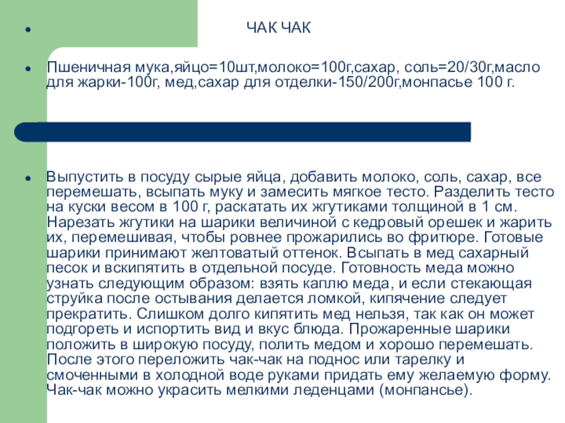 Выпустить в посуду сырые яйца, добавить молоко, соль, сахар, все перемешать, всыпать муку и замесить мягкое тесто. Разделить тесто на куски весом в 100 г, раскатать их жгутиками толщиной в 1 см. Нарезать жгутики на шарики величиной с кедровый орешек и жарить их, перемешивая, чтобы ровнее прожарились во фритюре. Готовые шарики принимают желтоватый оттенок. Всыпать в мед сахарный песок и вскипятить в отдельной посуде. Готовность меда можно узнать следующим образом: взять каплю меда, и если стекающая струйка после остывания делается ломкой, кипячение следует прекратить. Слишком долго кипятить мед нельзя, так как он может подгореть и испортить вид и вкус блюда. Прожаренные шарики положить в широкую посуду, полить медом и хорошо перемешать. После этого переложить чак-чак на поднос или тарелку и смоченными в холодной воде руками придать ему желаемую форму. Чак-чак можно украсить мелкими леденцами (монпансье).