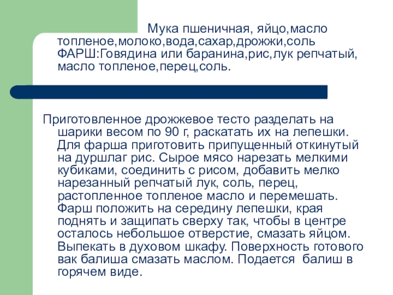 Приготовленное дрожжевое тесто разделать на шарики весом по 90 г, раскатать их на лепешки. Для фарша приготовить припущенный откинутый на дуршлаг рис. Сырое мясо нарезать мелкими кубиками, соединить с рисом, добавить мелко нарезанный репчатый лук, соль, перец, растопленное топленое масло и перемешать. Фарш положить на середину лепешки, края поднять и защипать сверху так, чтобы в центре осталось небольшое отверстие, смазать яйцом. Выпекать в духовом шкафу. Поверхность готового вак балиша смазать маслом. Подается балиш в горячем виде.