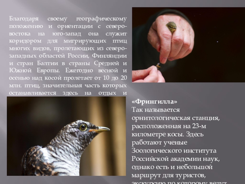 Так называется орнитологическая станция, расположенная на 23-м километре косы. Здесь работают ученые Зоологического института Российской академии наук, однако есть и небольшой маршрут для туристов, экскурсию по которому ведут профессиональные орнитологи.