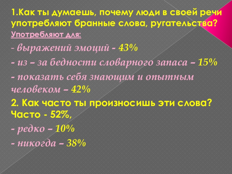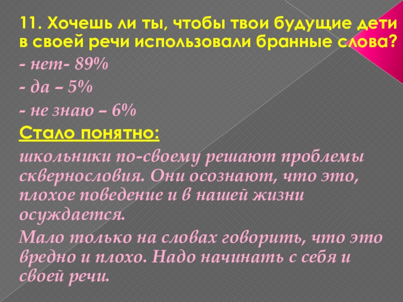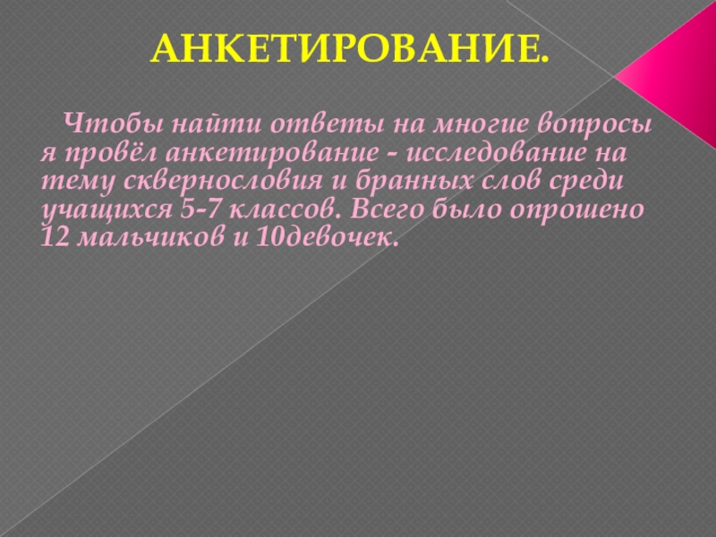 - исследование на тему сквернословия и бранных слов среди учащихся 5-7 классов. Всего было опрошено 12 мальчиков и 10девочек.