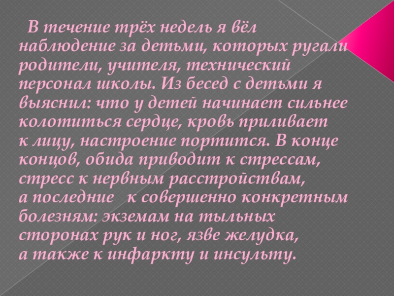 ругали родители, учителя, технический персонал школы. Из бесед с детьми я выяснил: что у детей начинает сильнее колотиться сердце, кровь приливает к лицу, настроение портится. В конце концов, обида приводит к стрессам, стресс к нервным расстройствам, а последние к совершенно конкретным болезням: экземам на тыльных сторонах рук и ног, язве желудка, а также к инфаркту и инсульту.