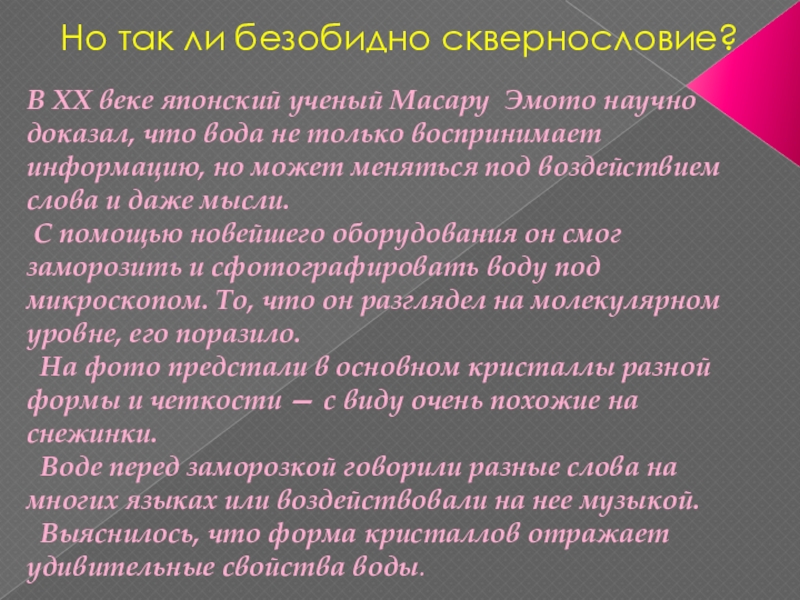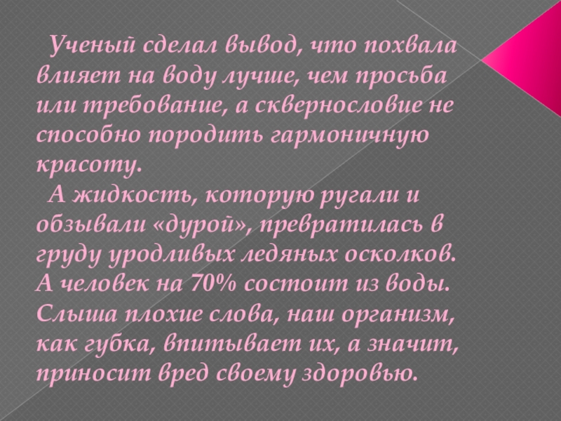 А человек на 70% состоит из воды. Слыша плохие слова, наш организм, как губка, впитывает их, а значит, приносит вред своему здоровью.