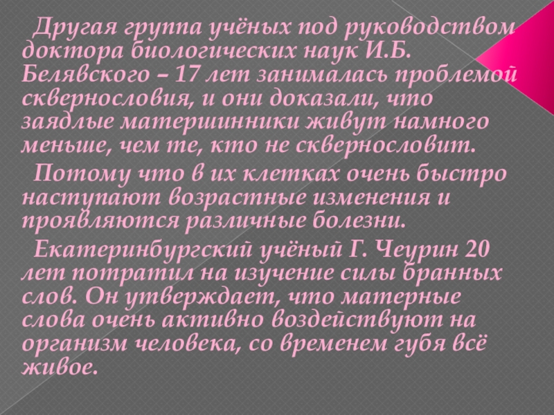 Екатеринбургский учёный Г. Чеурин 20 лет потратил на изучение силы бранных слов. Он утверждает, что матерные слова очень активно воздействуют на организм человека, со временем губя всё живое.