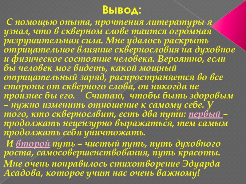 слове таится огромная разрушительная сила. Мне удалось раскрыть отрицательное влияние сквернословия на духовное и физическое состояние человека. Вероятно, если бы человек мог видеть, какой мощный отрицательный заряд, распространяется во все стороны от скверного слова, он никогда не произнес бы его. Считаю, чтобы быть здоровым – нужно изменить отношение к самому себе. У того, кто сквернослвит, есть два пути: первый – продолжать нецензурно выражаться, тем самым продолжать себя уничтожать.
