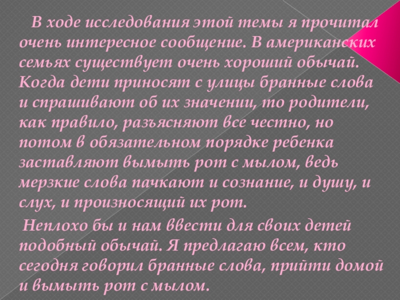сообщение. В американских семьях существует очень хороший обычай. Когда дети приносят с улицы бранные слова и спрашивают об их значении, то родители, как правило, разъясняют все честно, но потом в обязательном порядке ребенка заставляют вымыть рот с мылом, ведь мерзкие слова пачкают и сознание, и душу, и слух, и произносящий их рот.