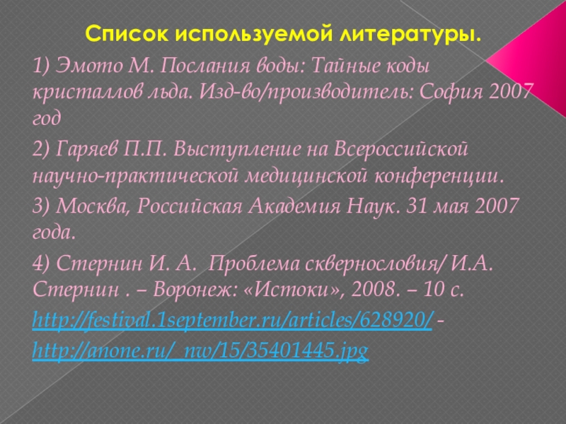 4) Стернин И. А. Проблема сквернословия/ И.А.Стернин . – Воронеж: «Истоки», 2008. – 10 с.