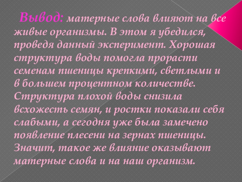 Слайд 24 Вывод: матерные слова влияют на все живые организмы. В этом