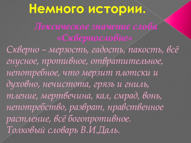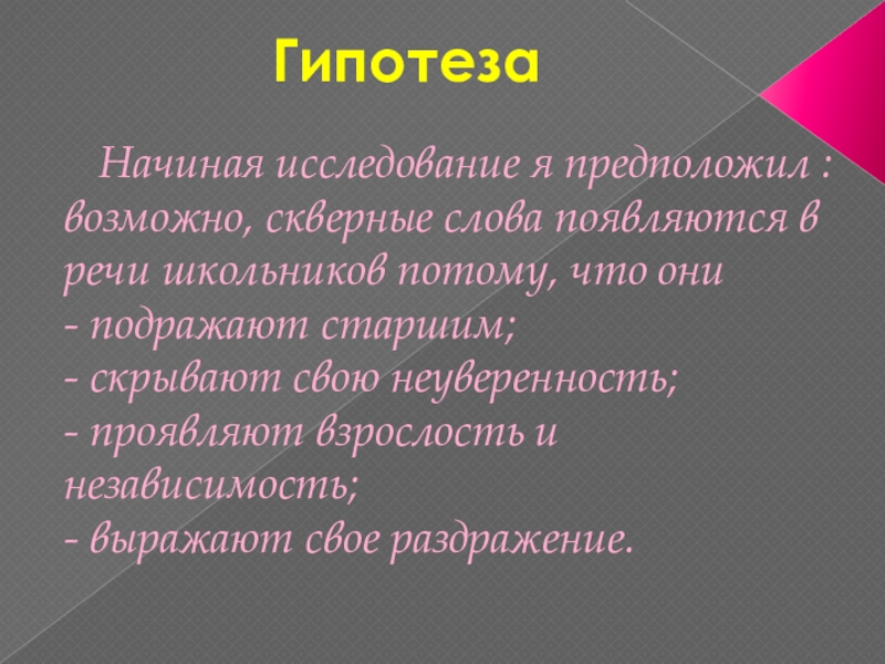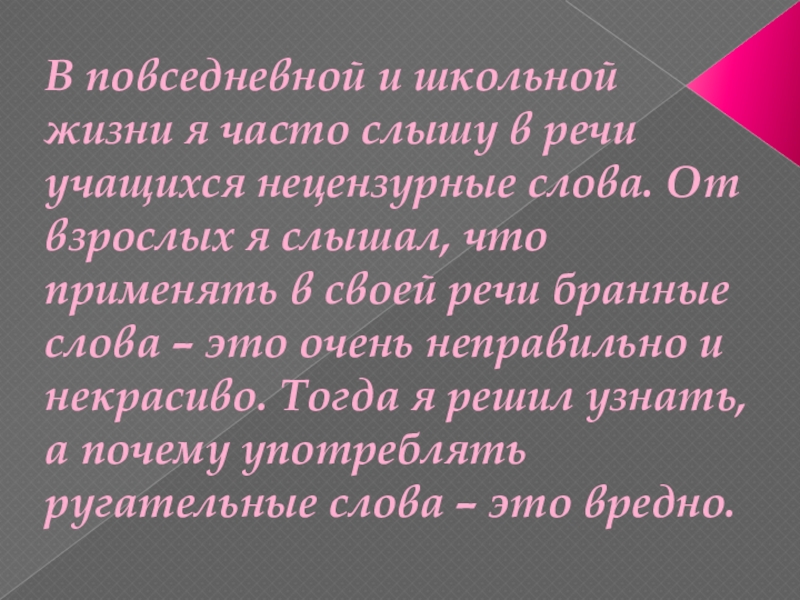 нецензурные слова. От взрослых я слышал, что применять в своей речи бранные слова – это очень неправильно и некрасиво. Тогда я решил узнать, а почему употреблять ругательные слова – это вредно.