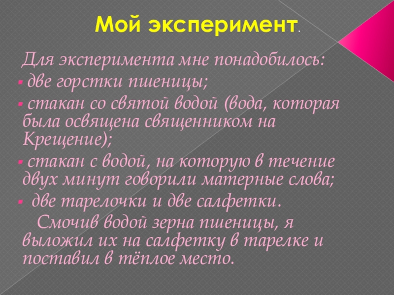 я убедился, проведя данный эксперимент. Хорошая структура воды помогла прорасти семенам пшеницы крепкими, светлыми и в большем процентном количестве. Структура плохой воды снизила всхожесть семян, и ростки показали себя слабыми, а сегодня уже была замечено появление плесени на зернах пшеницы. Значит, такое же влияние оказывают матерные слова и на наш организм.