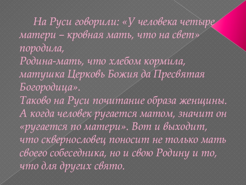 Таково на Руси почитание образа женщины. А когда человек ругается матом, значит он «ругается по матери». Вот и выходит, что сквернословец поносит не только мать своего собеседника, но и свою Родину и то, что для других свято.