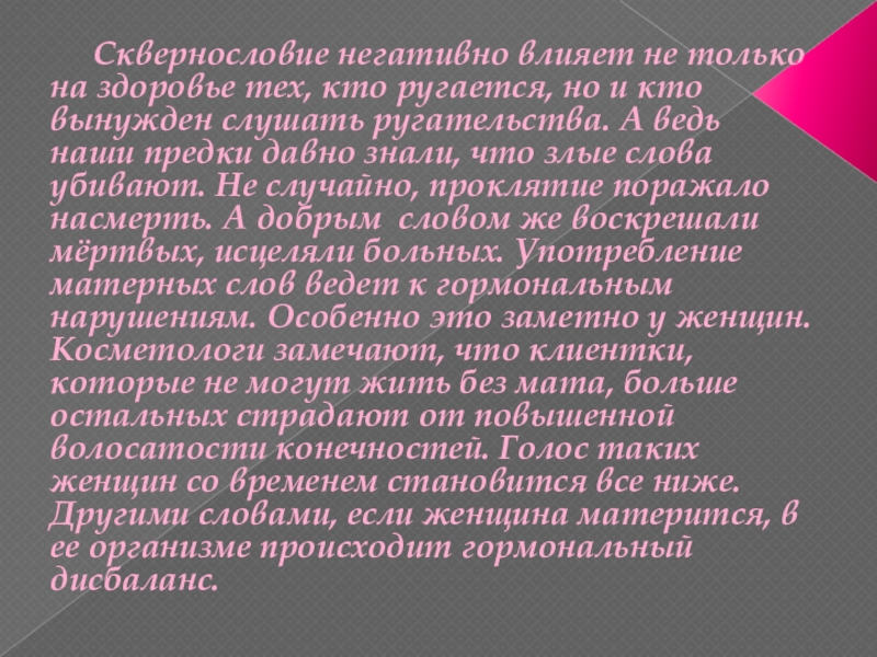 кто ругается, но и кто вынужден слушать ругательства. А ведь наши предки давно знали, что злые слова убивают. Не случайно, проклятие поражало насмерть. А добрым словом же воскрешали мёртвых, исцеляли больных. Употребление матерных слов ведет к гормональным нарушениям. Особенно это заметно у женщин. Косметологи замечают, что клиентки, которые не могут жить без мата, больше остальных страдают от повышенной волосатости конечностей. Голос таких женщин со временем становится все ниже. Другими словами, если женщина матерится, в ее организме происходит гормональный дисбаланс.
