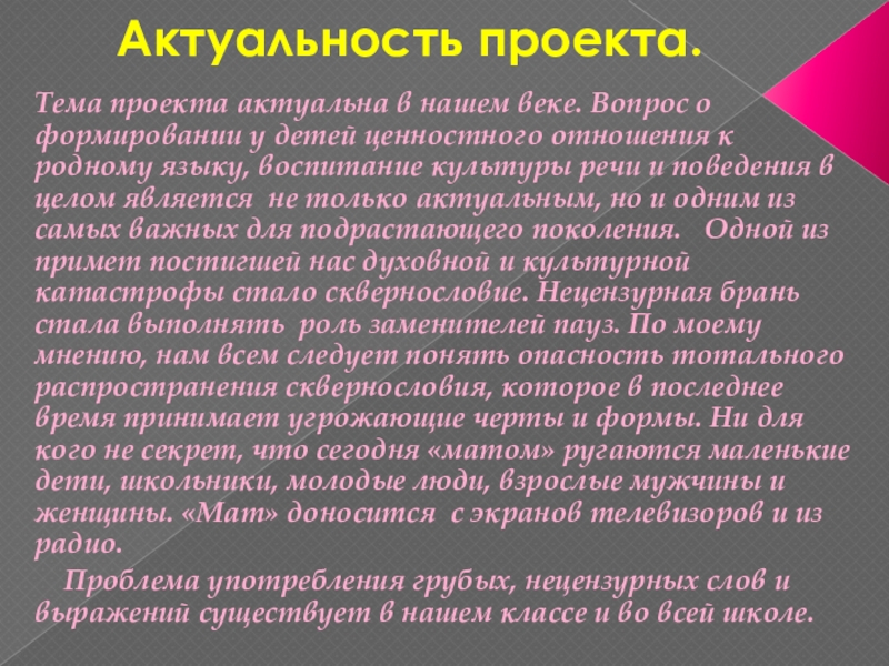 формировании у детей ценностного отношения к родному языку, воспитание культуры речи и поведения в целом является не только актуальным, но и одним из самых важных для подрастающего поколения. Одной из примет постигшей нас духовной и культурной катастрофы стало сквернословие. Нецензурная брань стала выполнять роль заменителей пауз. По моему мнению, нам всем следует понять опасность тотального распространения сквернословия, которое в последнее время принимает угрожающие черты и формы. Ни для кого не секрет, что сегодня «матом» ругаются маленькие дети, школьники, молодые люди, взрослые мужчины и женщины. «Мат» доносится с экранов телевизоров и из радио.