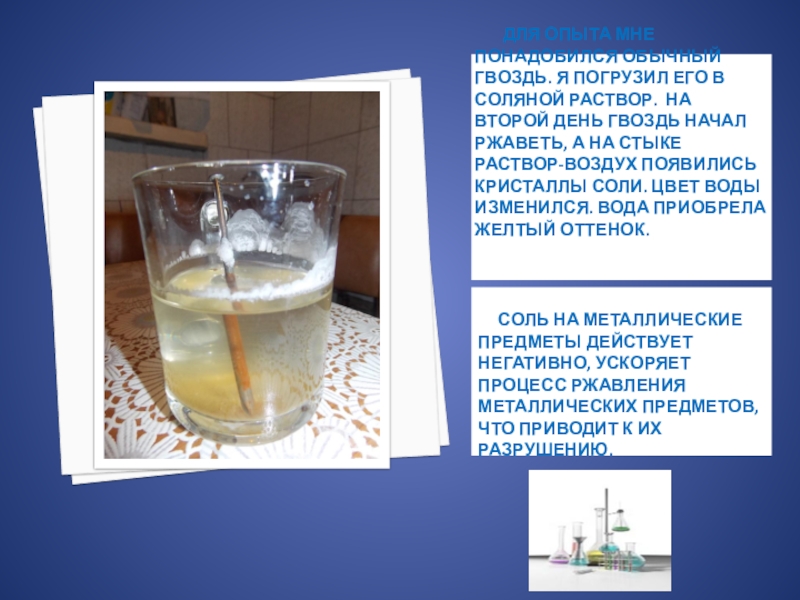 соль на металлические предметы действует негативно, ускоряет процесс ржавления металлических предметов, что приводит к их разрушению.