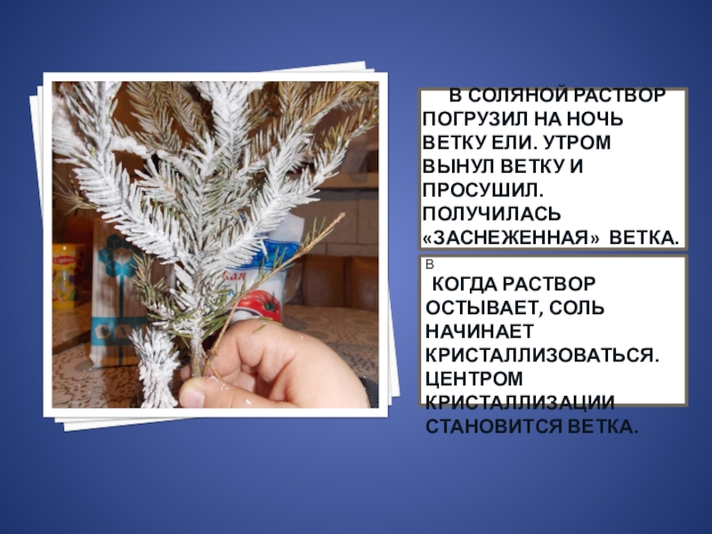 Когда раствор остывает, соль начинает кристаллизоваться. Центром кристаллизации становится ветка.