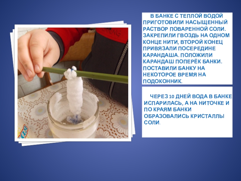 Через 10 дней вода в банке испарилась, а на ниточке и по краям банки образовались кристаллы соли.