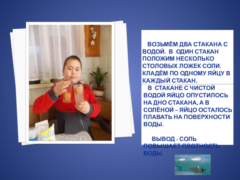 В стакане с чистой водой яйцо опустилось на дно стакана, а в солёной – яйцо осталось плавать на поверхности воды.