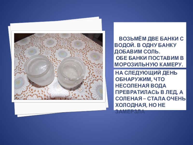 На следующий день обнаружим, что несоленая вода превратилась в лед, а соленая – стала очень холодная, но не замерзла