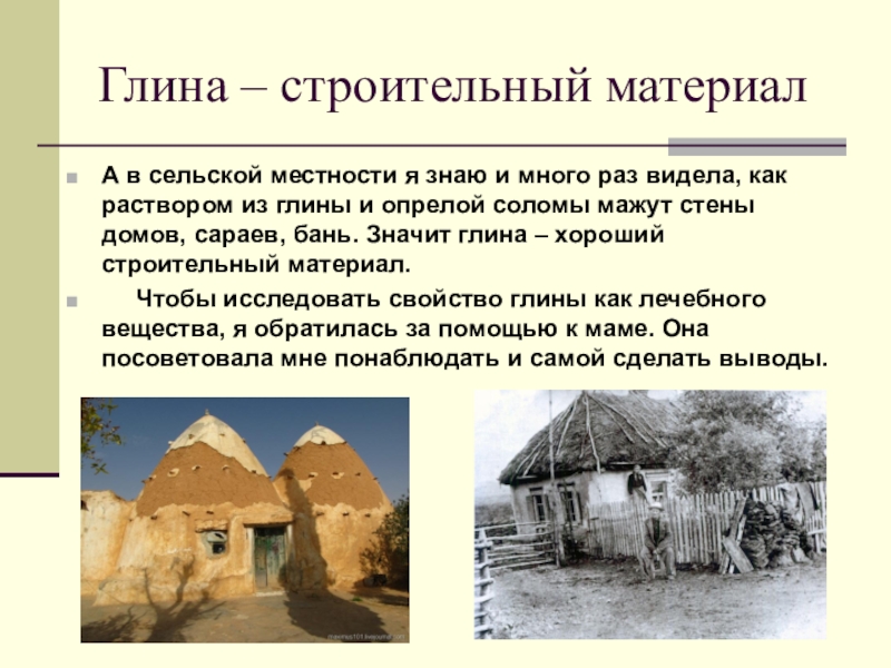 раз видела, как раствором из глины и опрелой соломы мажут стены домов, сараев, бань. Значит глина – хороший строительный материал.