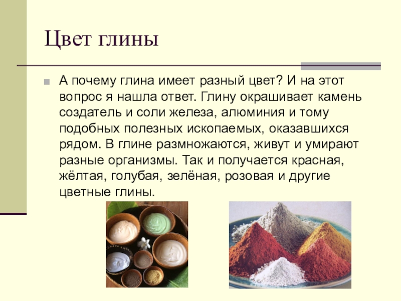 я нашла ответ. Глину окрашивает камень создатель и соли железа, алюминия и тому подобных полезных ископаемых, оказавшихся рядом. В глине размножаются, живут и умирают разные организмы. Так и получается красная, жёлтая, голубая, зелёная, розовая и другие цветные глины.