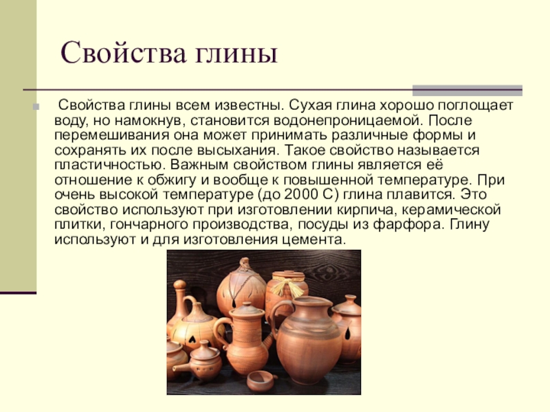 но намокнув, становится водонепроницаемой. После перемешивания она может принимать различные формы и сохранять их после высыхания. Такое свойство называется пластичностью. Важным свойством глины является её отношение к обжигу и вообще к повышенной температуре. При очень высокой температуре (до 2000 С) глина плавится. Это свойство используют при изготовлении кирпича, керамической плитки, гончарного производства, посуды из фарфора. Глину используют и для изготовления цемента.