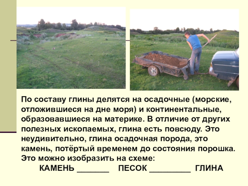 и континентальные, образовавшиеся на материке. В отличие от других полезных ископаемых, глина есть повсюду. Это неудивительно, глина осадочная порода, это камень, потёртый временем до состояния порошка. Это можно изобразить на схеме: