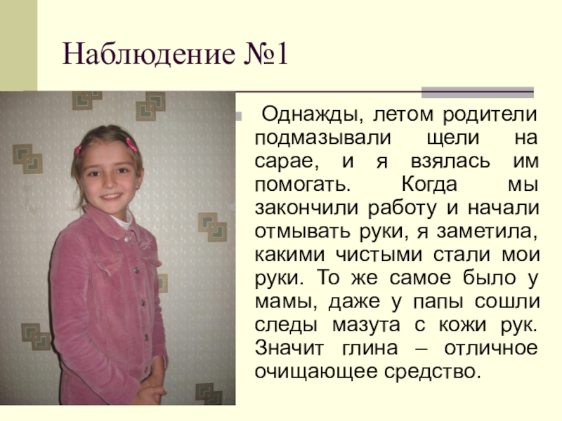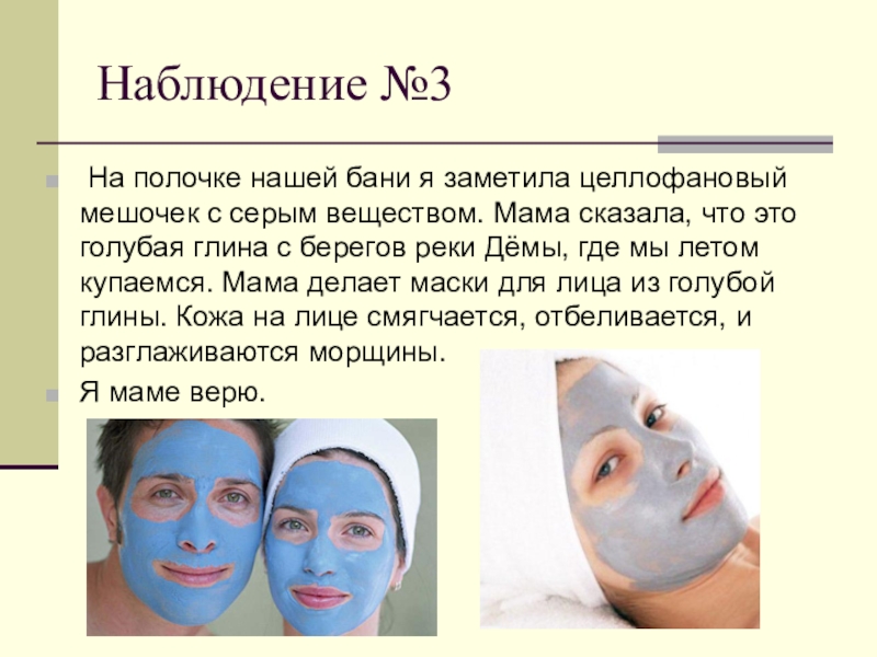 Чтобы исследовать свойство глины как лечебного вещества, я обратилась за помощью к маме. Она посоветовала мне понаблюдать и самой сделать выводы.