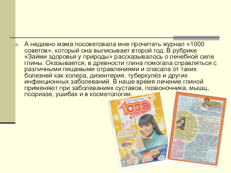 выписывает второй год. В рубрике «Займи здоровья у природы» рассказывалось о лечебной силе глины. Оказывается, в древности глина помогала справляться с различными пищевыми отравлениями и спасала от таких болезней как холера, дизентерия, туберкулёз и других инфекционных заболеваний. В наше время лечение глиной применяют при заболеваниях суставов, позвоночника, мышц, псориазе, ушибах и в косметологии.