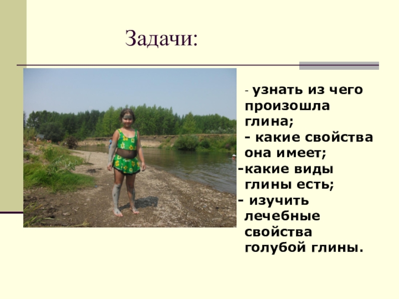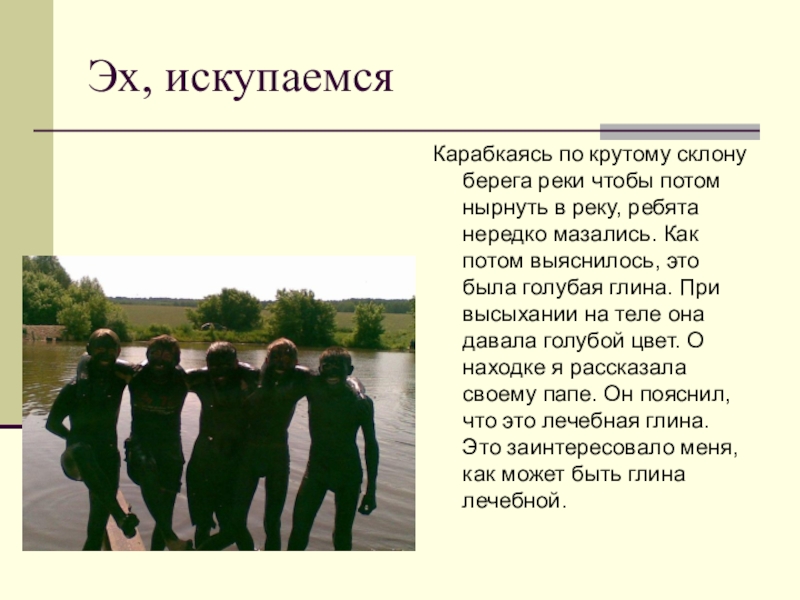 реку, ребята нередко мазались. Как потом выяснилось, это была голубая глина. При высыхании на теле она давала голубой цвет. О находке я рассказала своему папе. Он пояснил, что это лечебная глина. Это заинтересовало меня, как может быть глина лечебной.