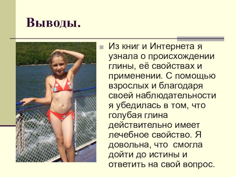 и применении. С помощью взрослых и благодаря своей наблюдательности я убедилась в том, что голубая глина действительно имеет лечебное свойство. Я довольна, что смогла дойти до истины и ответить на свой вопрос.