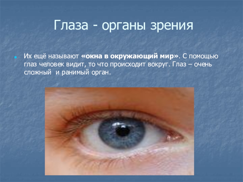 Глаза - органы зренияИх ещё называют «окна в окружающий мир». С помощью глаз человек видит,