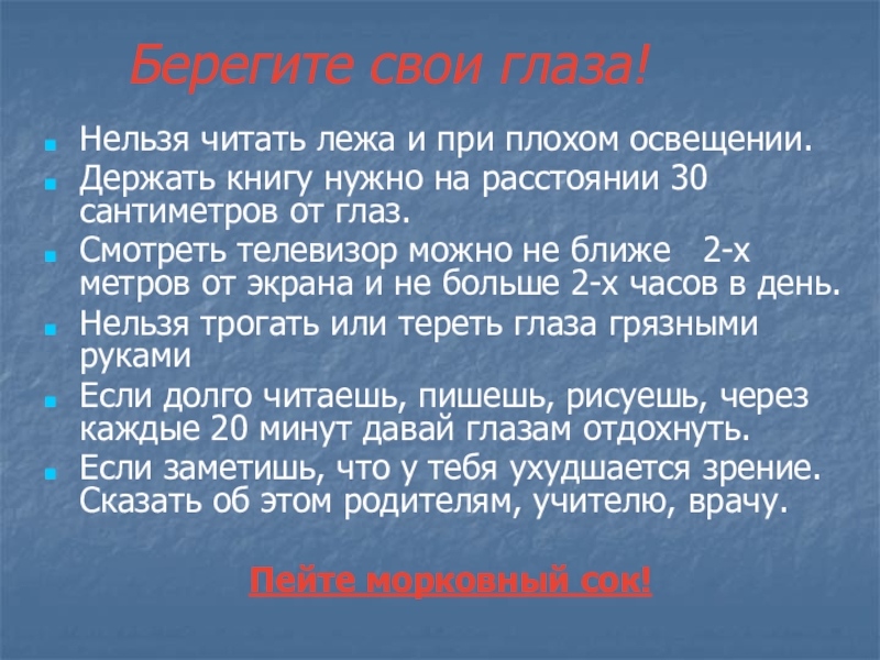 Берегите свои глаза!Нельзя читать лежа и при плохом освещении.Держать книгу нужно на расстоянии 30 сантиметров от глаз.Смотреть