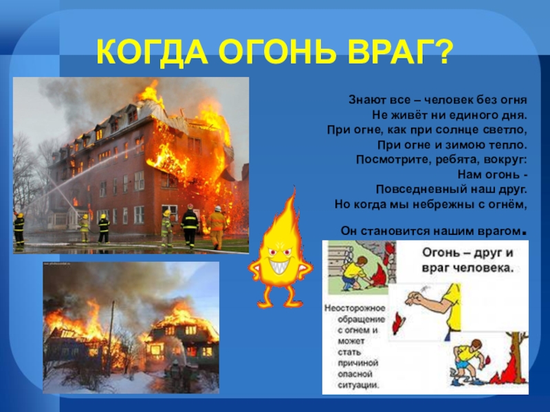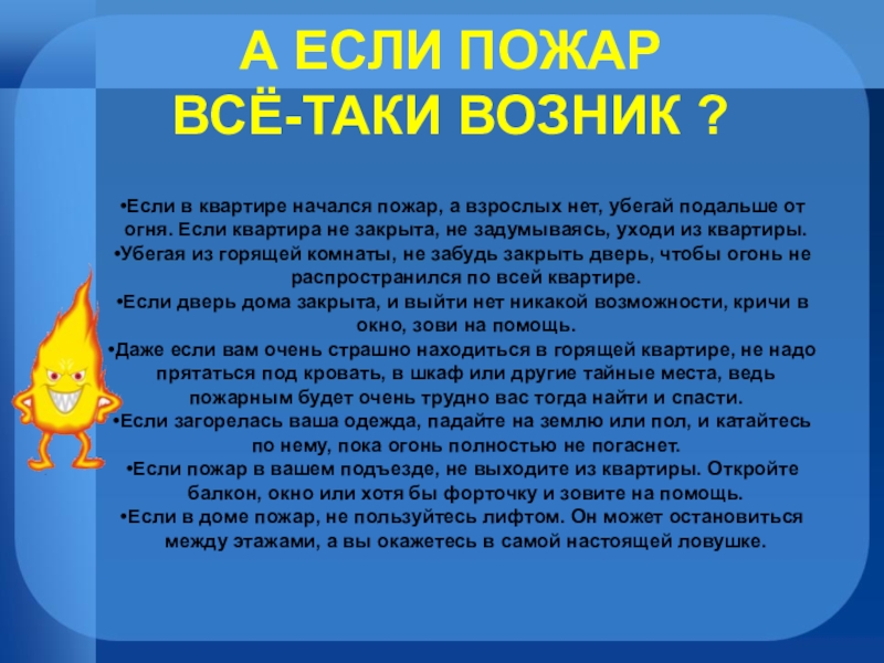 Если в квартире начался пожар, а взрослых нет, убегай подальше от огня. Если квартира не закрыта, не задумываясь, уходи из квартиры.